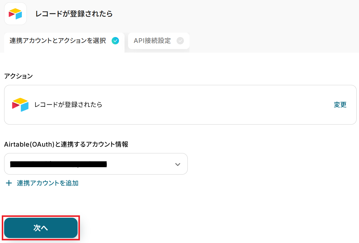 タイトル と連携するアカウント情報 を任意で設定し、アクションはテンプレート通りに「レコードが登録されたら」のまま「次へ」をクリックします。