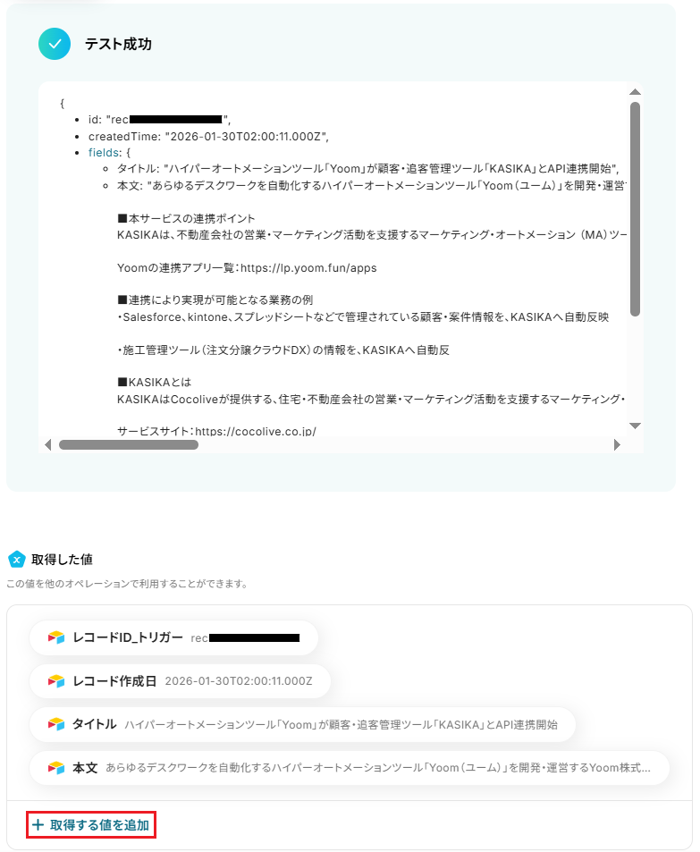 成功したら保存してください。ここで取得した値を次以降のステップで活用します。 ※取得した値 とは? トリガーやオペレーション設定時に「テスト」を実行して取得した値のことです。後続のオペレーション設定時の値として利用でき、フローボットを起動する度に変動した値となります。 なお、取得した値に取得したいレコードが反映されていないことがあります。その場合「+ 取得する値を追加」から項目を追加できます。