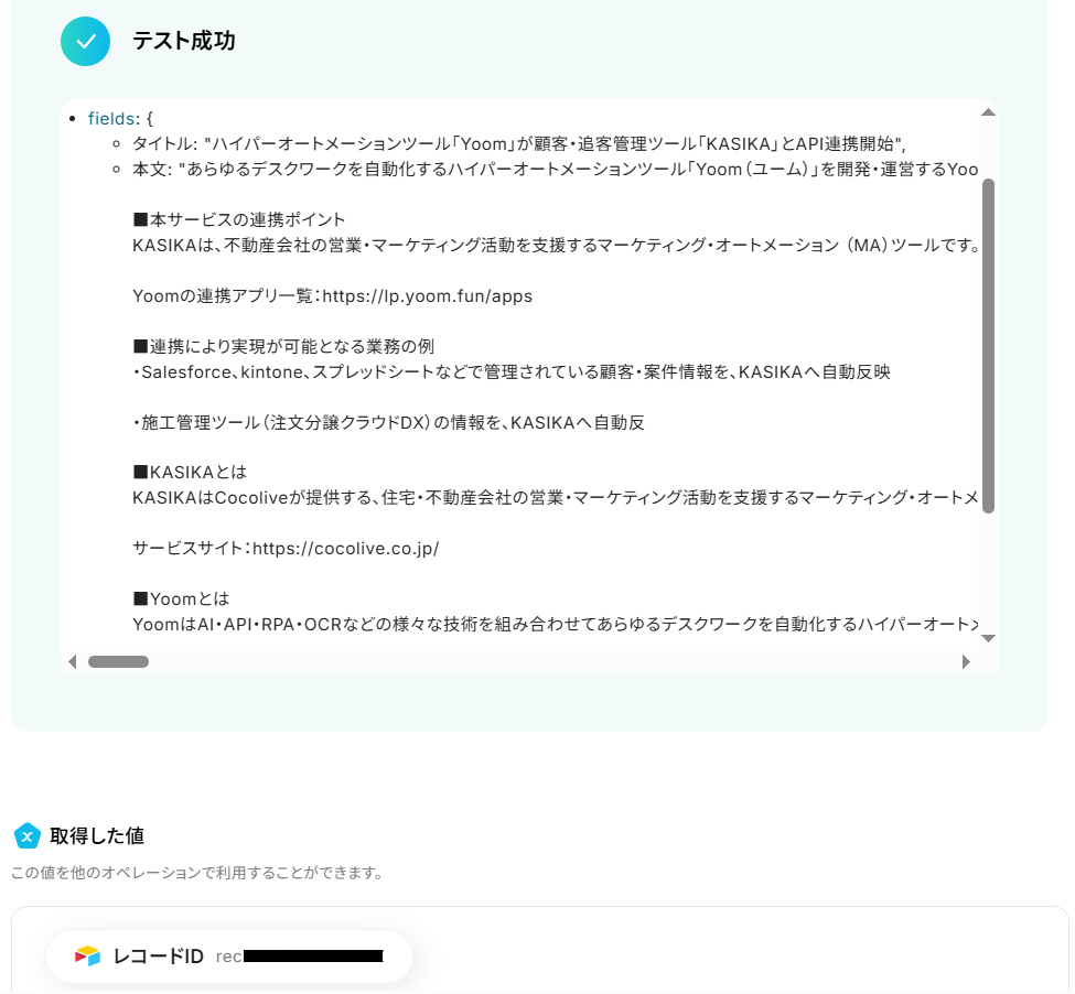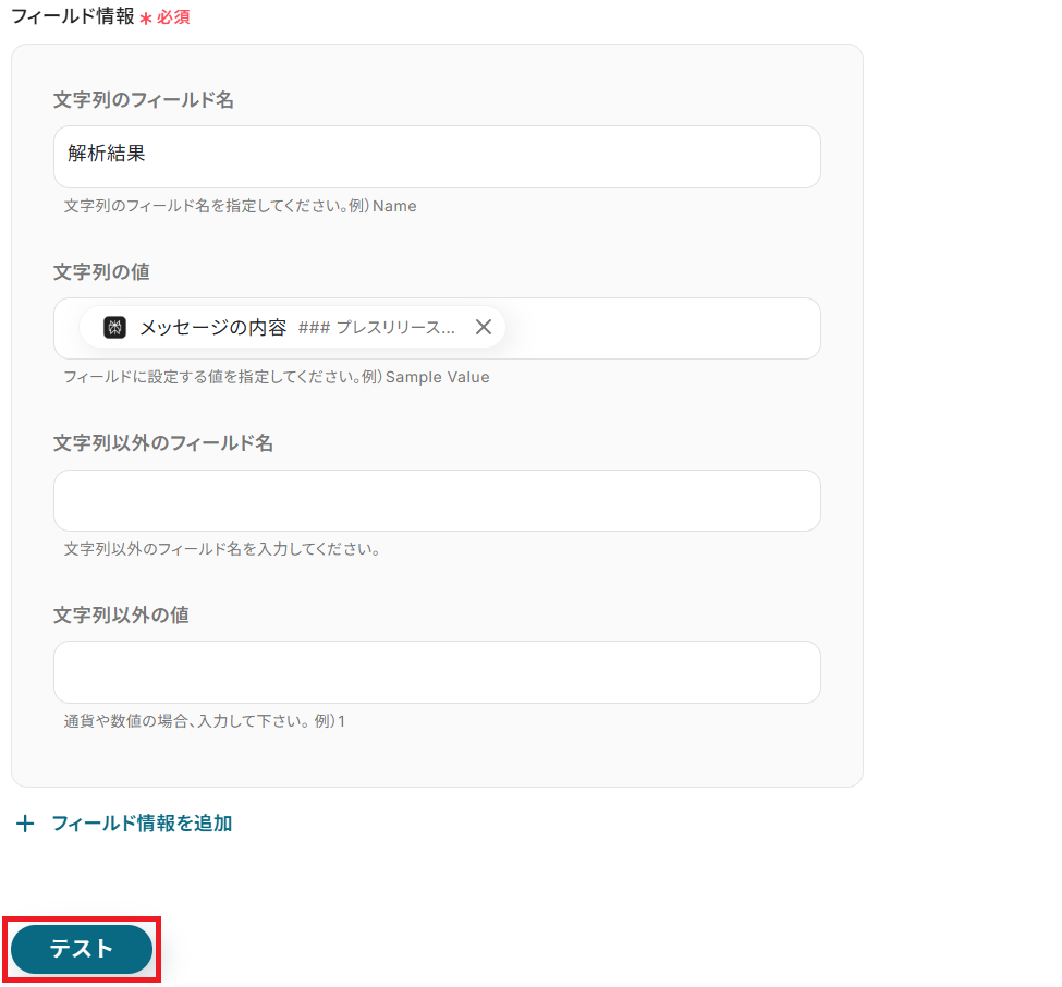 設定が完了したらテストしてください。 ※今回の「解析結果」は文字列なので文字列のフィールド名 ・文字列の値 の欄を使用していますが、文字列以外を記録したい場合は文字列以外のフィールド名 ・文字列以外の値 の欄を使用しましょう。