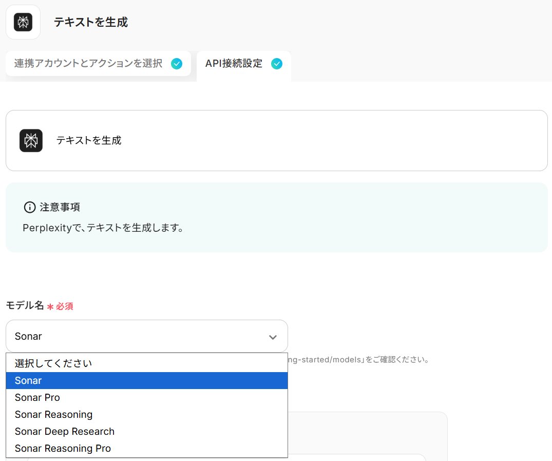 ステップ4:Perplexityのアクション設定 先ほど取得したAirtable上の記事情報をPerplexityの解析にかけます。