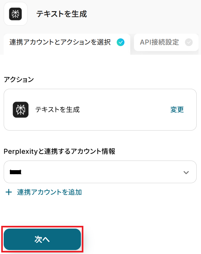 ステップ3と同様、アクションは「テキストを生成」のまま「次へ」をクリックします。