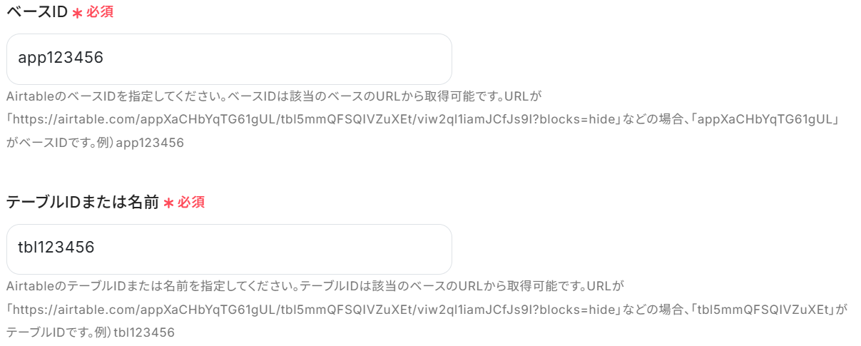 次に、テキストボックス下部の説明通りにベースID ・テーブルID ・Created Timeのフィールド名 を入力してテストしましょう。 ※今回は「Created Time」という名称を使ってテーブルを作成しましたが、他の名称でも問題ありません。