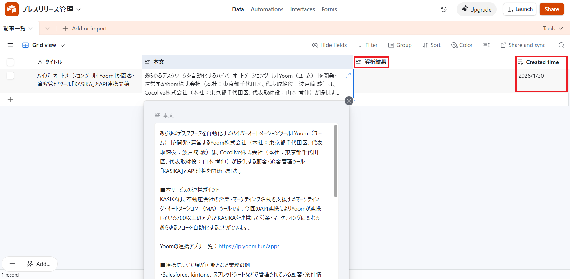 ステップ3:Airtableのトリガー設定 はじめに、テスト用テーブルをご用意ください。今回は例として、Airtableに追加した記事情報をPerplexityの解析にかけ、その結果を「解析結果」欄に記録する想定で進めていきます。