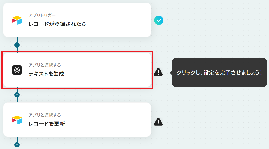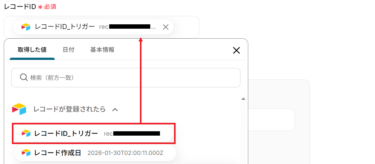 レコードID の欄には、トリガーで取得した「レコードID_トリガー」の値が予め設定されているのでそのままで大丈夫です。