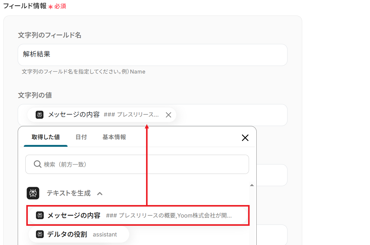文字列の値 …レコードに記録したい内容です。Perplexityから取得した「メッセージの内容」の値を設定しましょう。