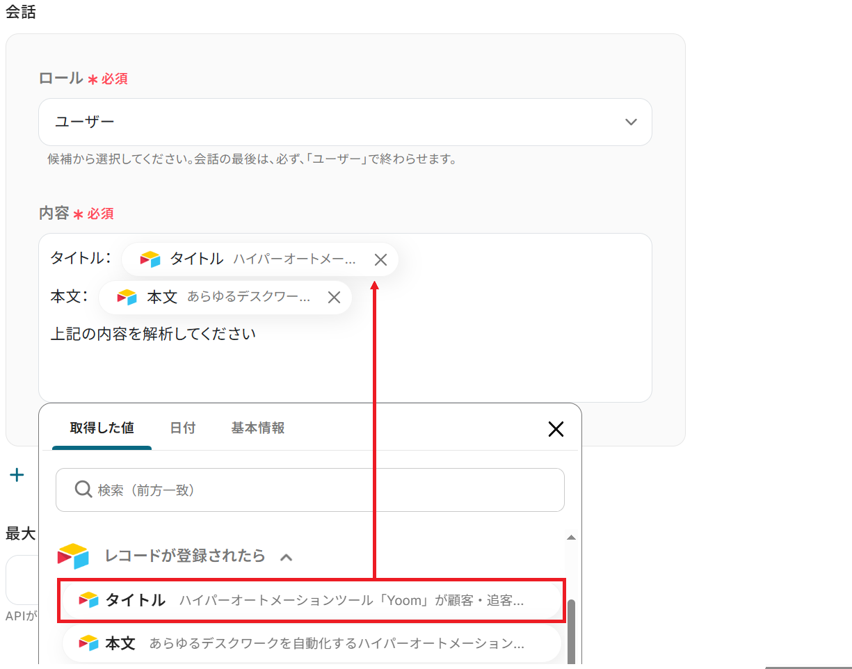 ユーザー …Perplexityへの指示内容です。Airtableから取得した「タイトル」や「本文」の値、固定の文章などを組み合わせて設定してください。