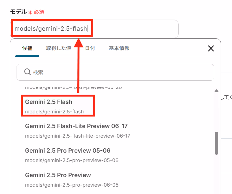 「モデル」でコンテンツ生成に使用するGeminiのモデルを選びましょう。