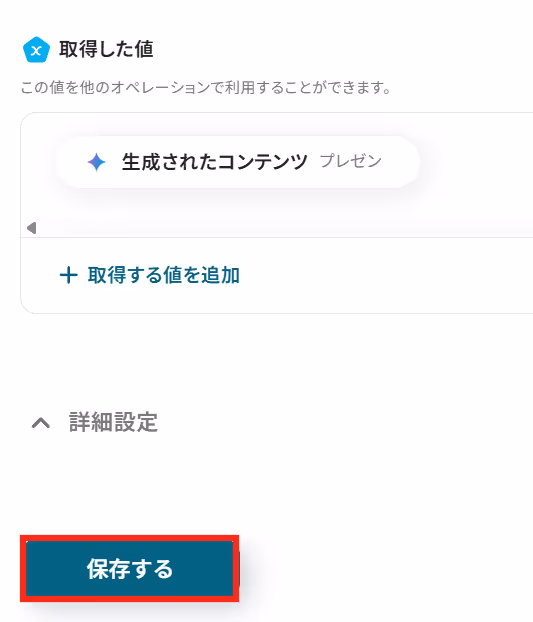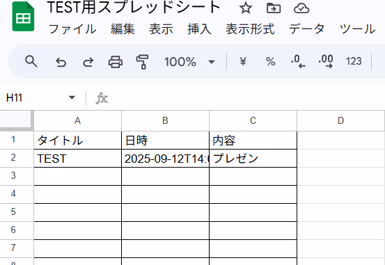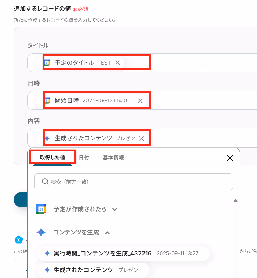 これにより、Googleカレンダーの予定やGeminiの生成結果ごとに変わる情報をGoogle スプレッドシートへ動的に反映できます。