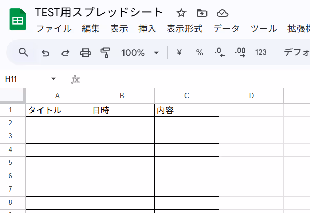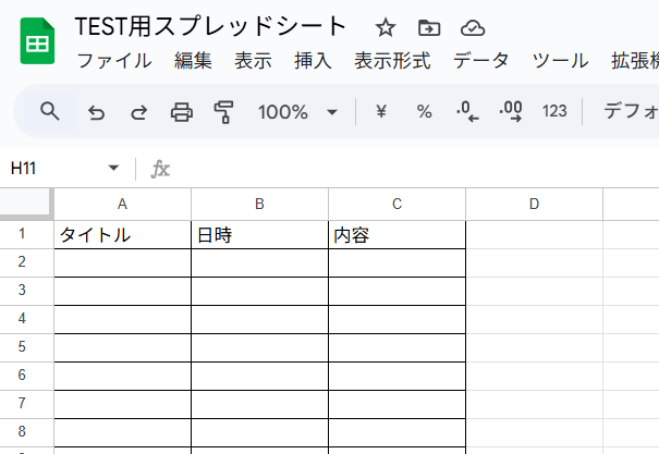 次に、テストで使用するスプレッドシートの情報を入力する必要があるため、まだシートを用意していない場合はこのタイミングでスプレッドシートを作成しておきましょう。