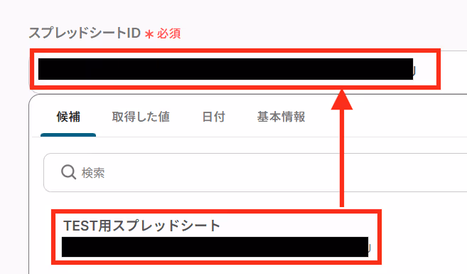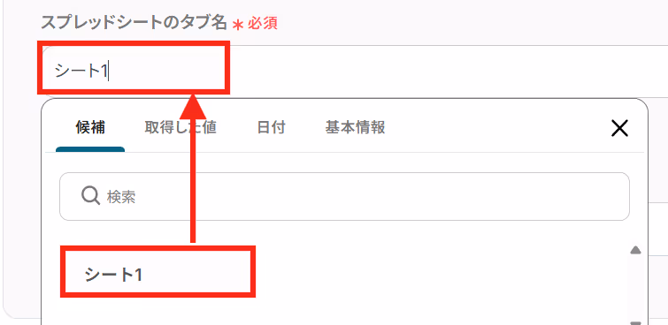 「スプレッドシートID」「スプレッドシートのタブ名」は入力欄をクリックすることで候補となる選択肢が表示されます。