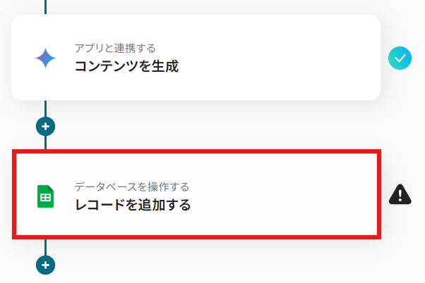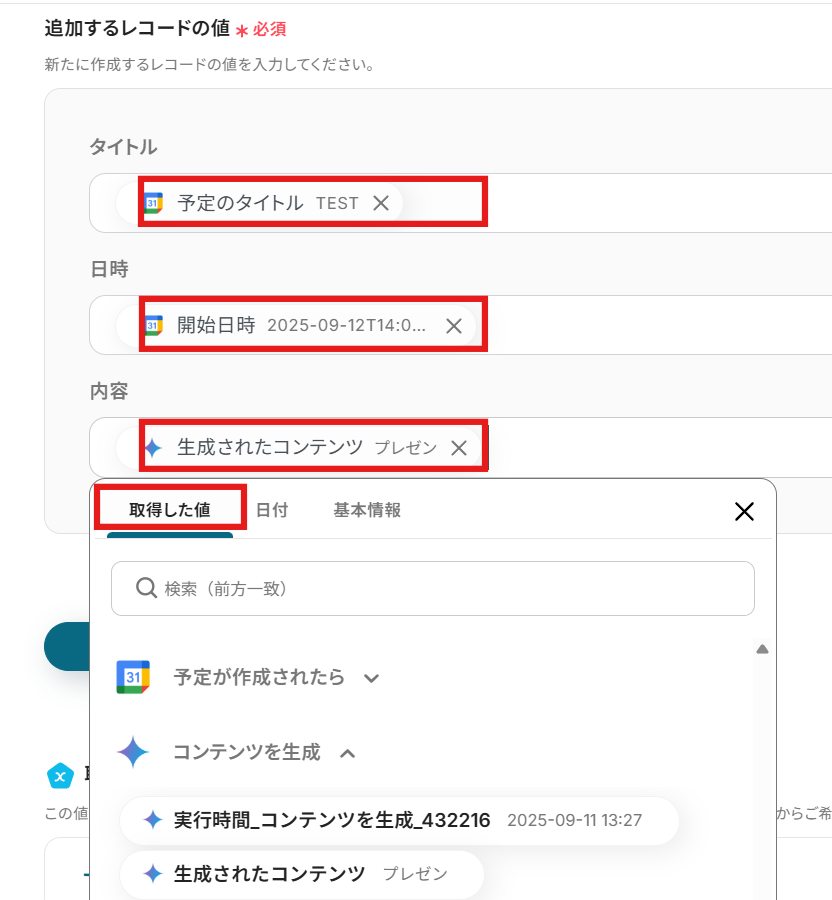 「追加するレコードの値」は、各入力欄をクリックすることで選択肢が表示されます。 シートで作成したヘッダーに見合った内容をそれぞれ取得した値から選択しましょう。 これにより、Googleカレンダーの予定やGeminiの生成結果ごとに変わる情報をGoogle スプレッドシートへ動的に反映できます。