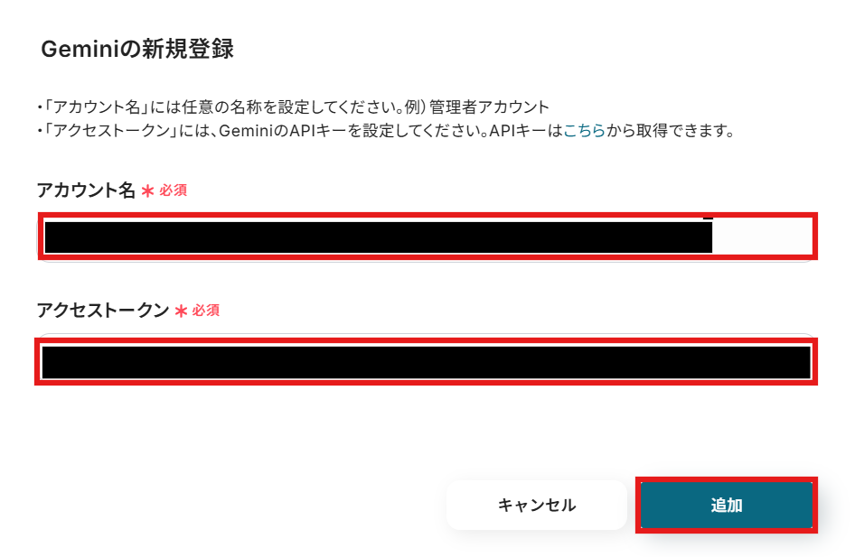 注意書きを参考に「アカウント名」と「アクセストークン」を入力します。 APIキーはこちら から取得できます。