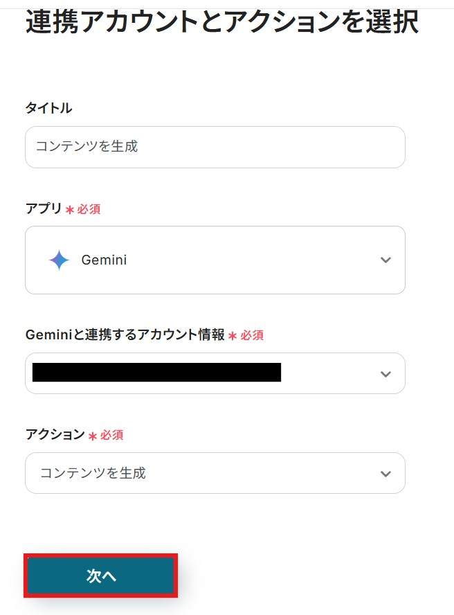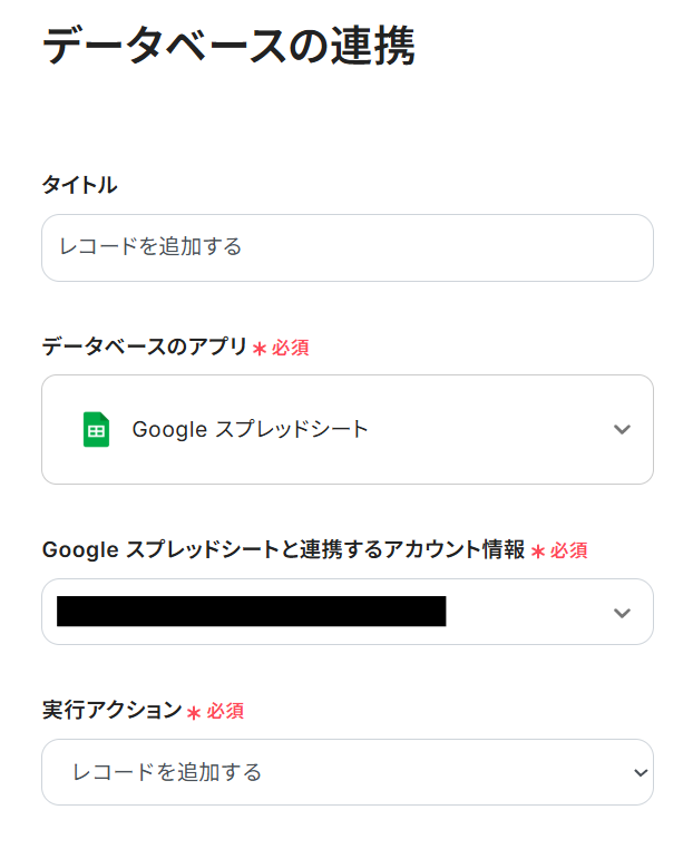 タイトルは任意でわかりやすいものを設定しましょう。 アカウント情報は、マイアプリ連携の際に設定したものになっているか確認してください。 アクションはデフォルトで入力されている状態のままで進めます。