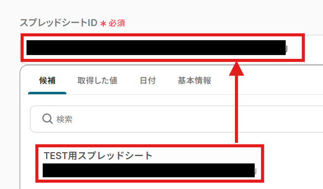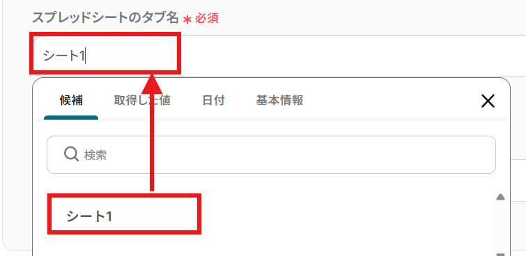 「スプレッドシートID」「スプレッドシートのタブ名」は入力欄をクリックすることで候補となる選択肢が表示されます。 該当するものを選択しましょう。
