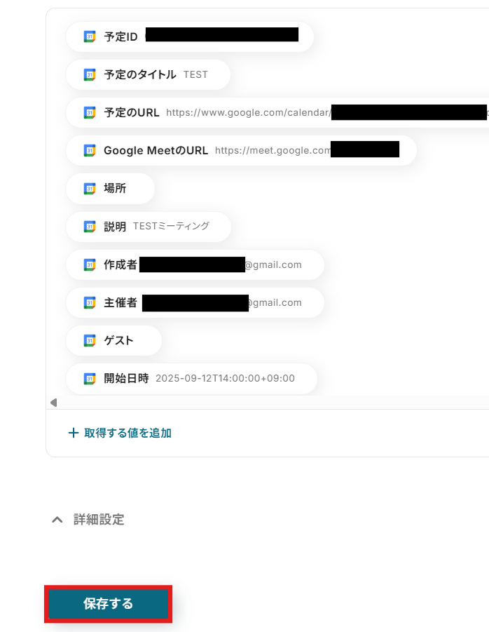 テストが成功すると、「テスト成功」という画面が表示され、Googleカレンダーから取得した情報をYoomで引用できるようになります。 取得した値を活用することで、手入力の時間を削減できます。 さらに、URLのように一文字違うだけで正しく開けなくなる情報も安心して扱えます。 詳しく知りたい方は、以下のリンク先をご覧ください。