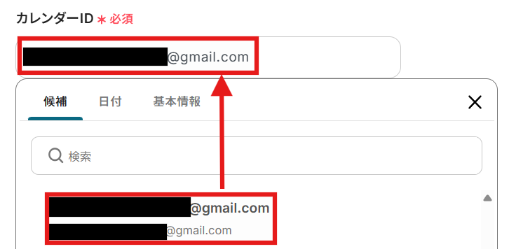 「カレンダーID」は入力欄をクリックすると選択肢が表示されますので、候補の中から選択しましょう。