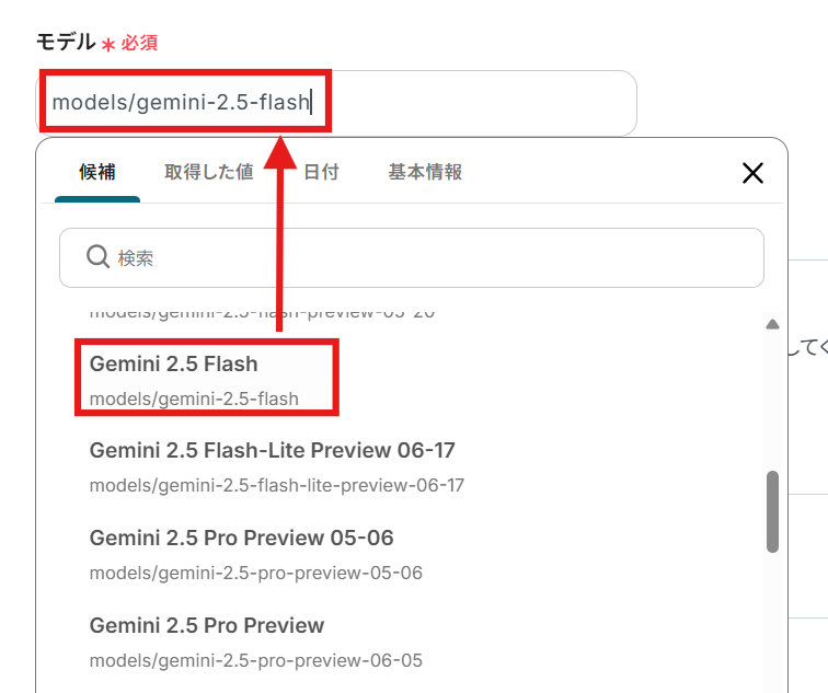 「モデル」でコンテンツ生成に使用するGeminiのモデルを選びましょう。 今回は「Gemini 2.5 Flash」を選択しました。 迷う場合は下記のページを参考にしてください。