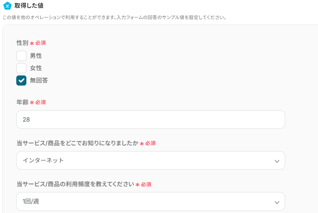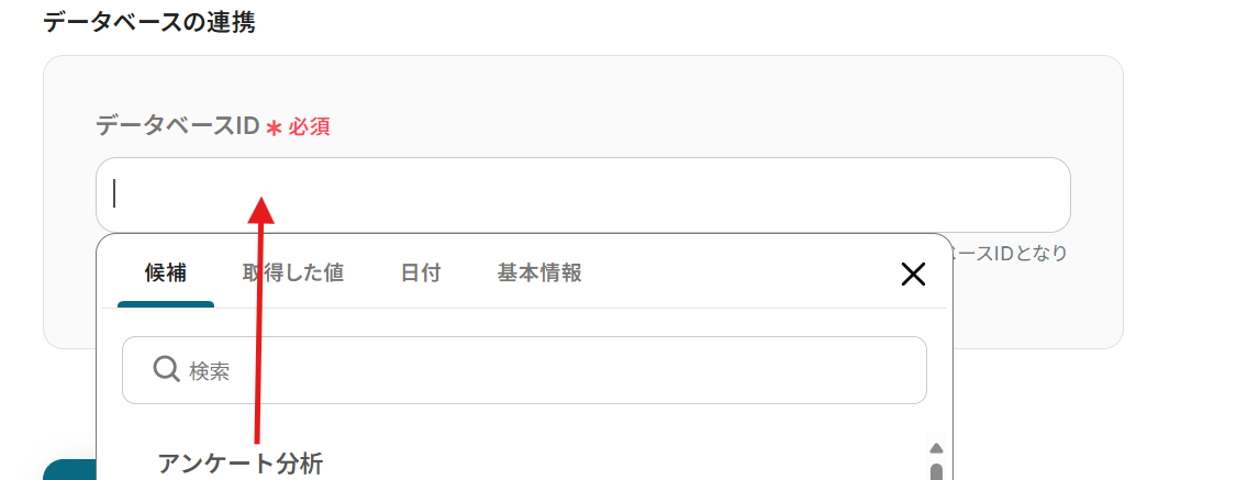 ※取得した値は変動するため、固定値で入力せずにアウトプットから選択してください。