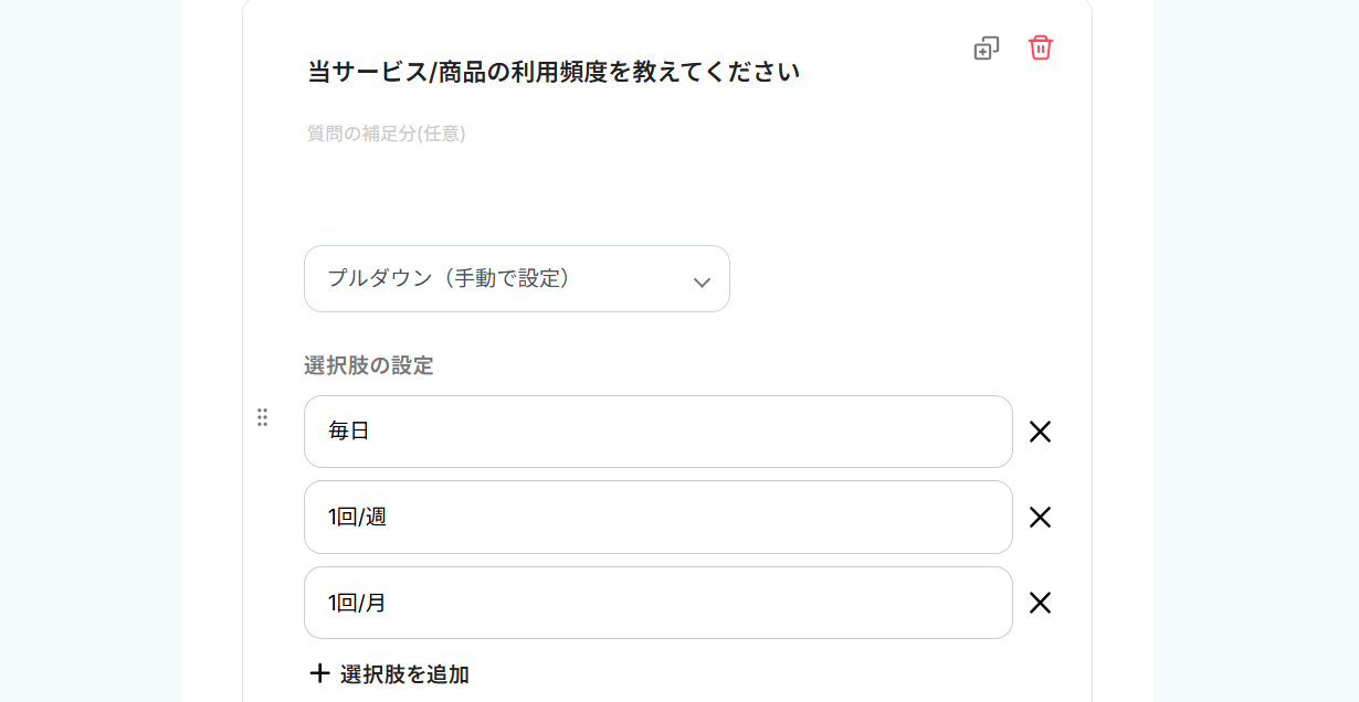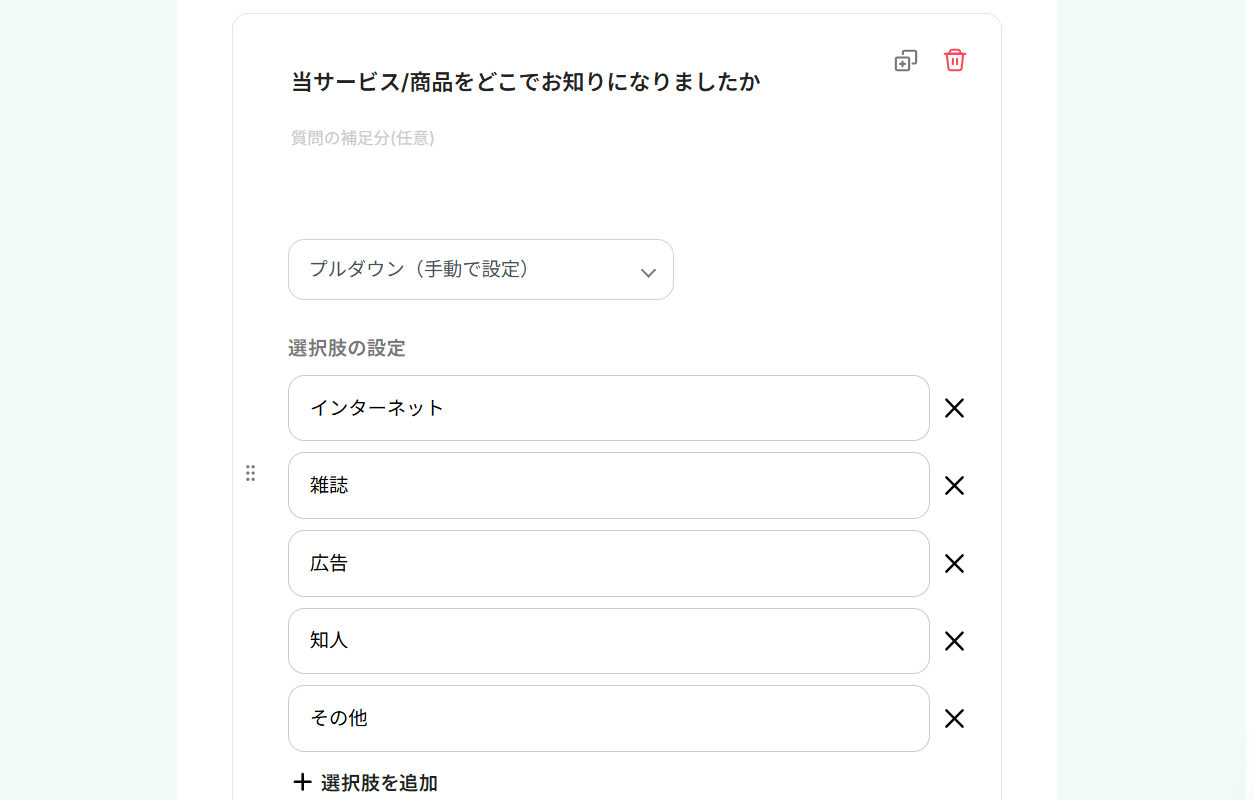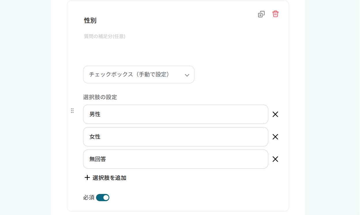 質問内容を増やしたい場合、「+質問を追加」をクリックすると追加できます。