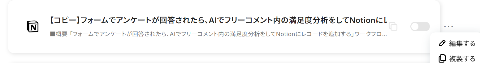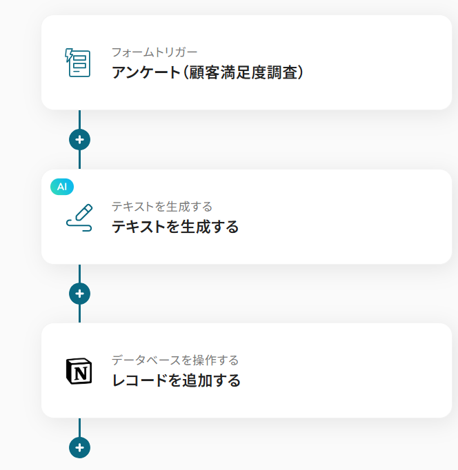 それではここから代表的な例として、フォームでアンケートが回答された際に、AIがフリーコメント内の満足度などを分析し、その結果をNotionのデータベースに自動でレコード追加するフローを解説していきます!