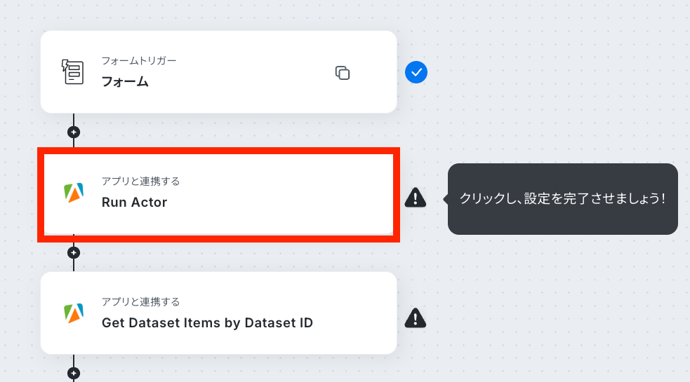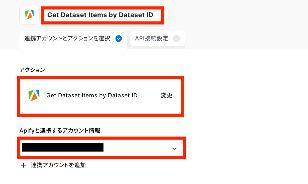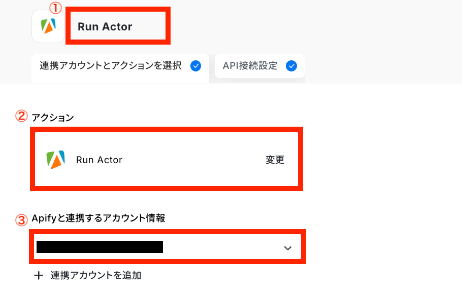 ②アクション:デフォルトで「Run Actor」が選択されているのでそのままで問題ありません! ③Apifyと連携するアカウント情報:ステップ1で連携したアカウントが表示されていることを確認しましょう。