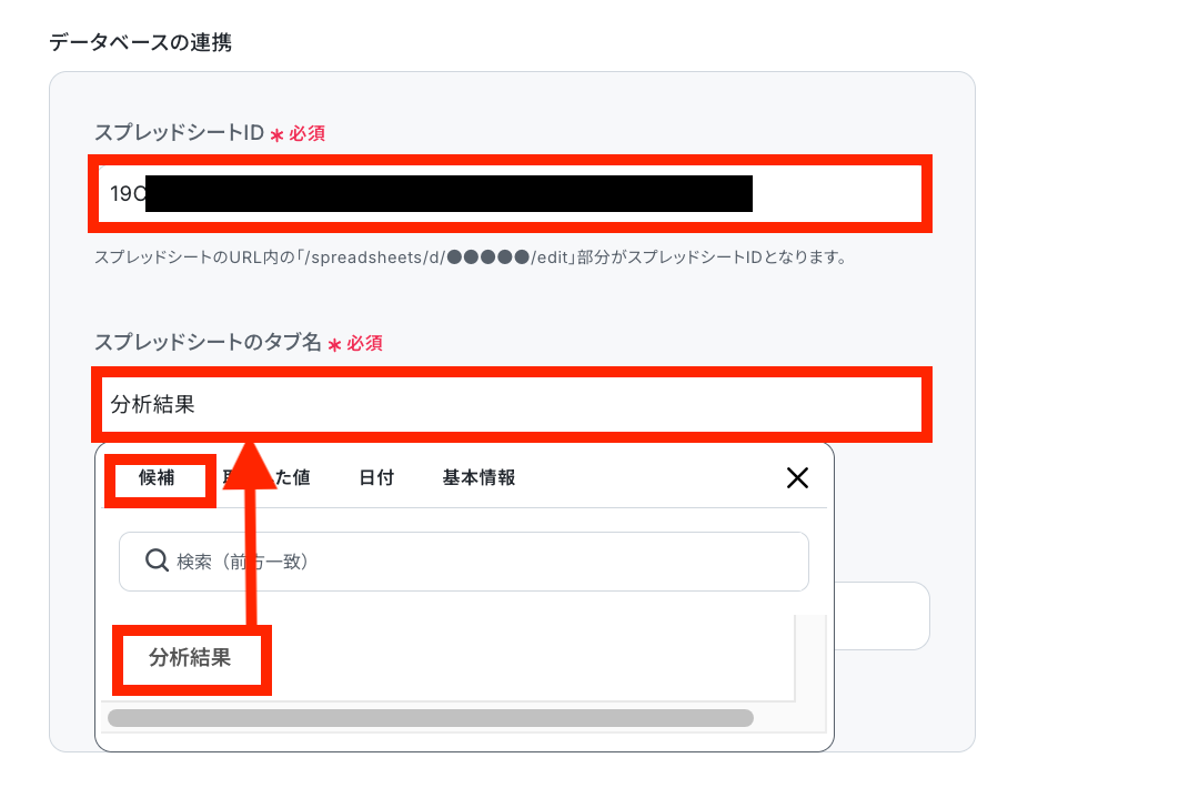 それでは準備したシートを連携していきましょう。 「スプレッドシートID」と「スプレッドシートのタブ名」は候補一覧から選択できます。 (「テーブル範囲」は任意項目です。今回ように一列のみであれば設定しなくてもOKです!)