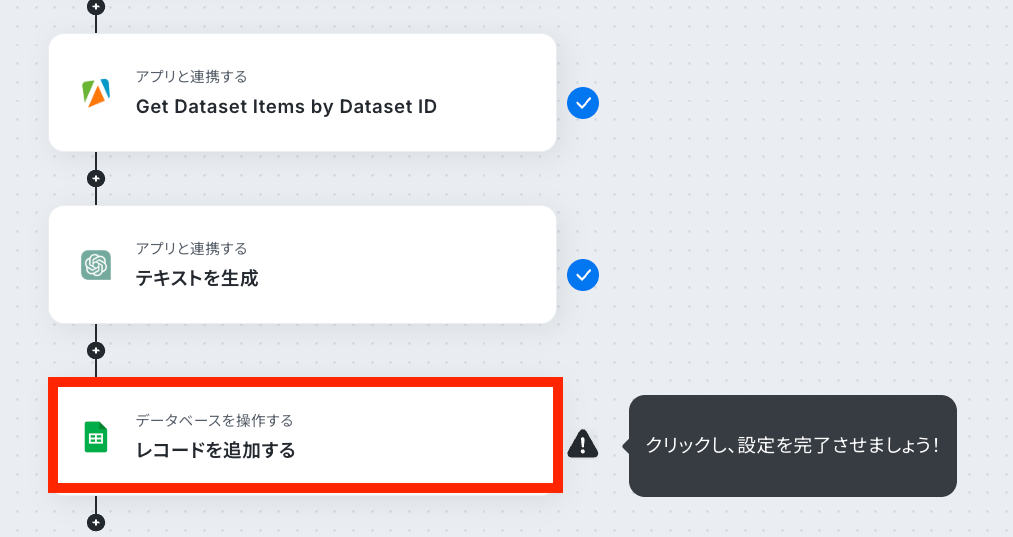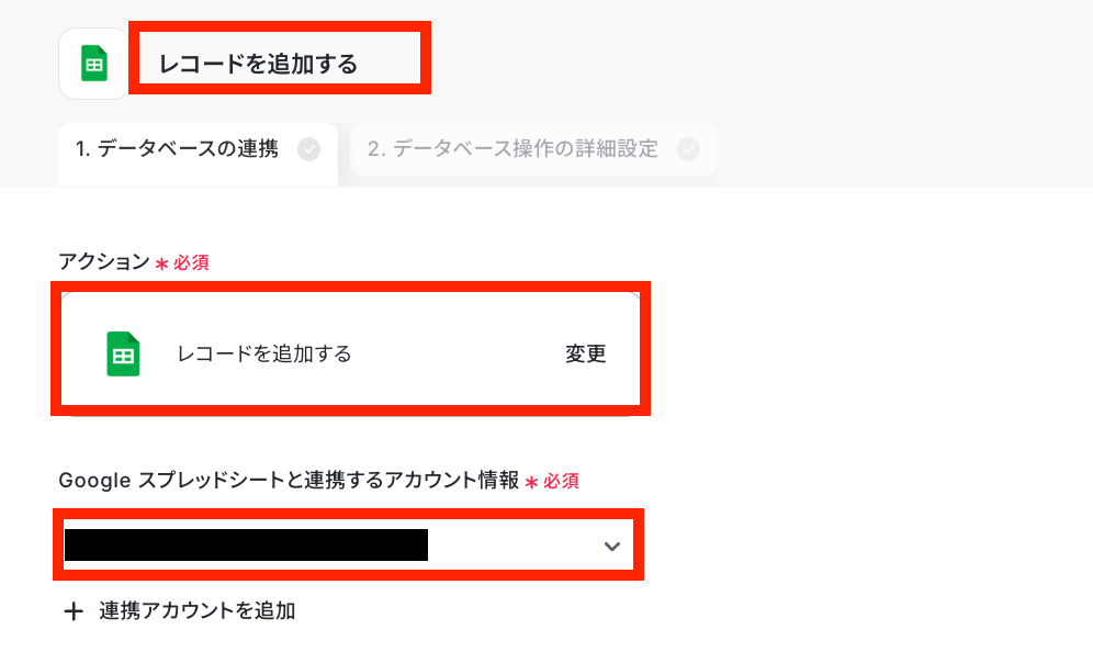 ステップ7:Google スプレッドシートのレコード追加設定 「レコードを追加する」をクリックします。