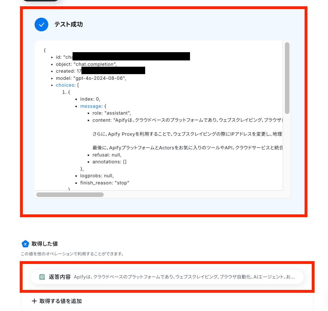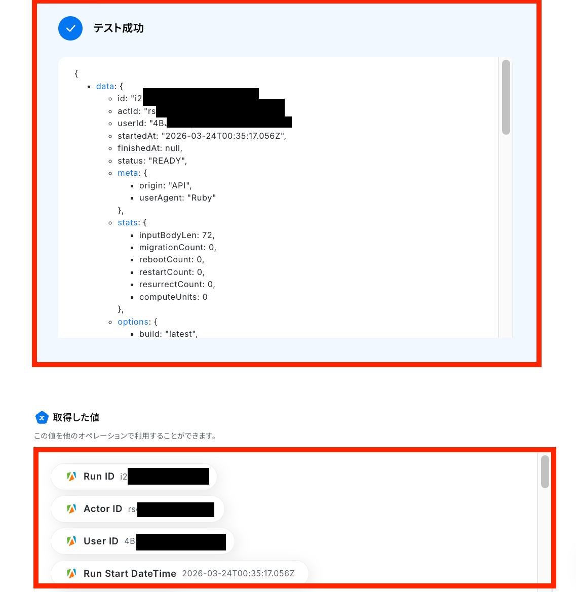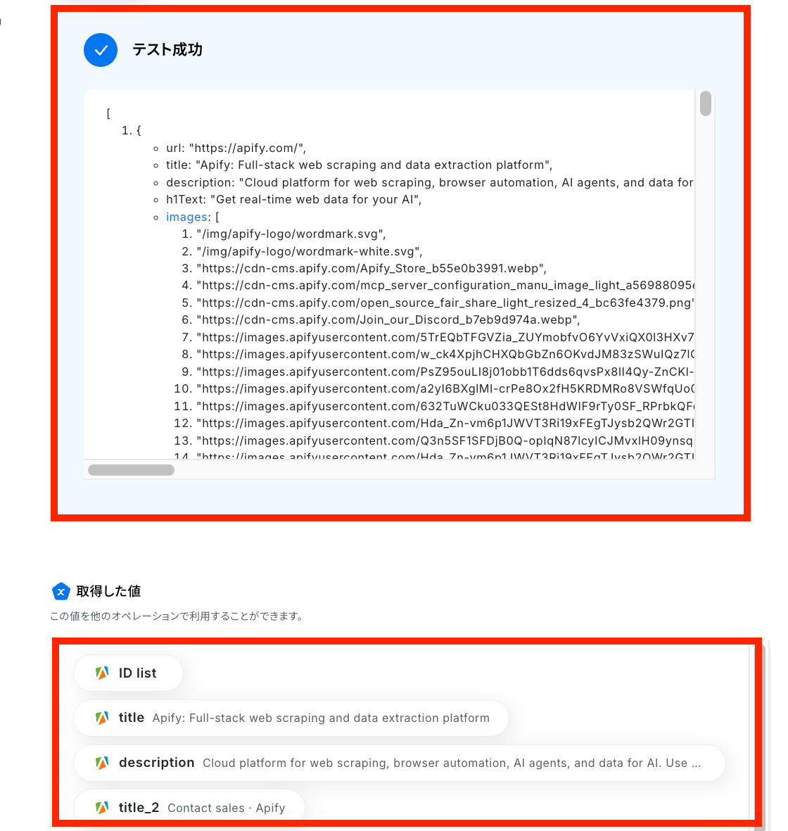テストに成功すると、Apifyのデータが「取得した値(※)」の欄に反映されるので、確認できたら「完了」をクリックしてください。 ※取得した値 とは? トリガーやオペレーション設定時に「テスト」を実行して取得した値のことです。 後続のオペレーション設定時の値として利用でき、フローボットを起動する度に変動した値になります。