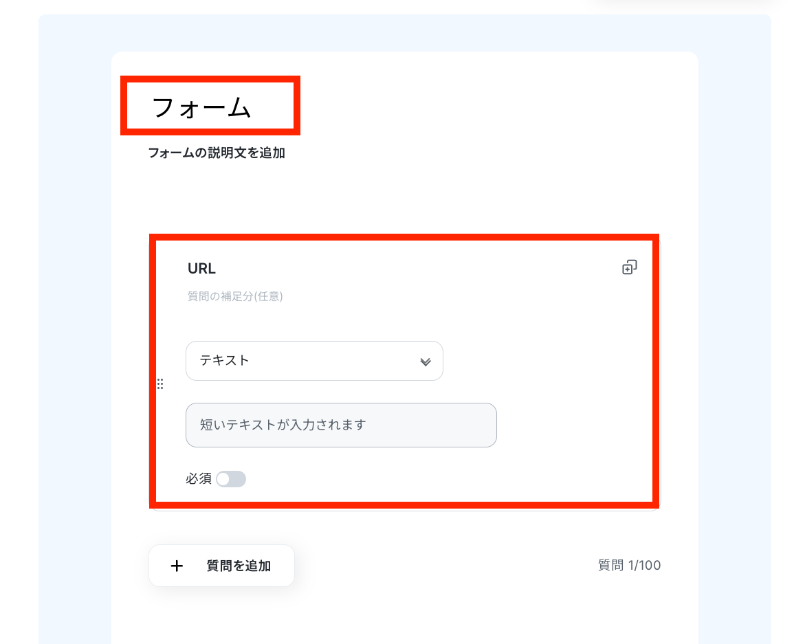 実際にYoomの画面上で「フォームのタイトル」や「入力項目」などを設定してフォームを作成していきます。 ※有料プランでのみ設定が可能な項目もあるので、詳しくはフォームの基本設定・オプション設定について をご確認ください。 ※URLだけでなくサイト名などの項目を追加することも可能です。フォームに設定した内容は、Google スプレッドシートに記録できるので必要な情報を追加してカスタマイズしてくださいね!