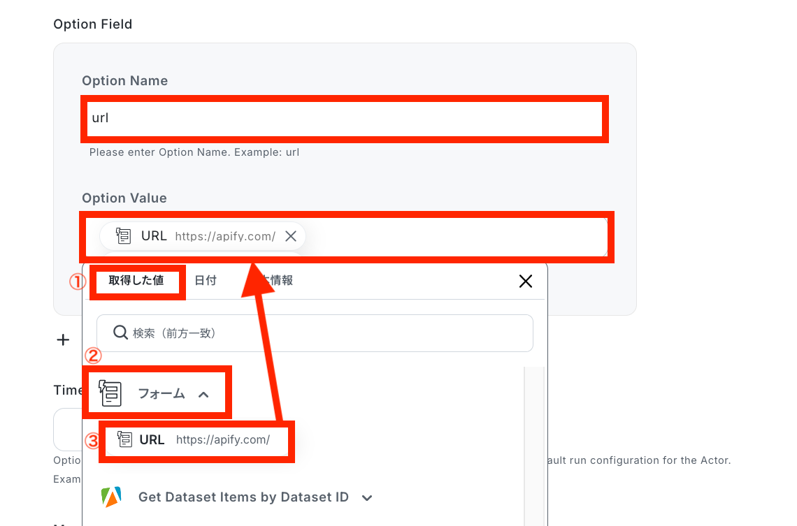 次に「Option Field」を設定します。 今回はURLを設定したいので「Opition Name」は「url」にします! そして「Option Value」はステップ3で取得した値(URL)を埋め込んでください。 手入力でURLを入力してしまうと、フローボットが起動する度に同じURLばかりが反映されてしまうので注意しましょう。 【取得した値を埋め込む方法】 ①入力欄をクリックして「取得した値」を表示 ②「フォーム」をクリック ③「URL」など埋め込みたい項目を選択