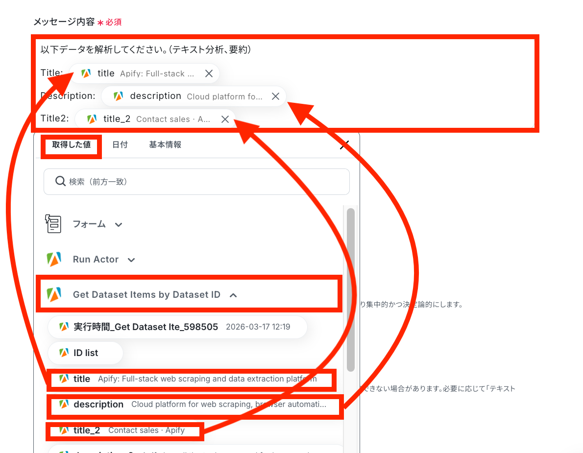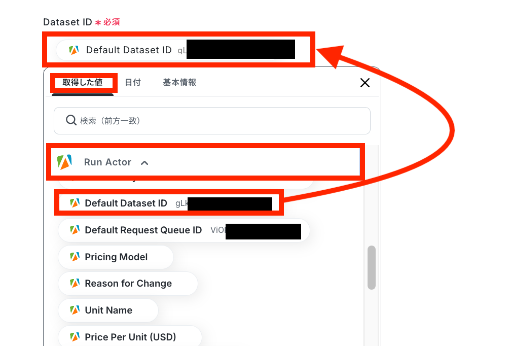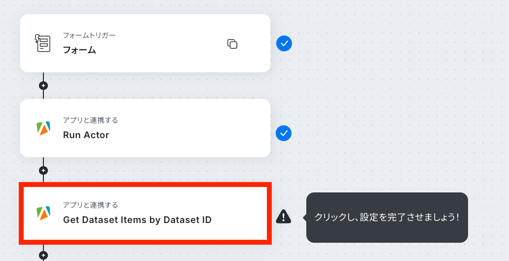 ステップ5:ApifyのGet Dataset Items by Dataset ID設定 「Get Dataset Items by Dataset ID」をクリックします。