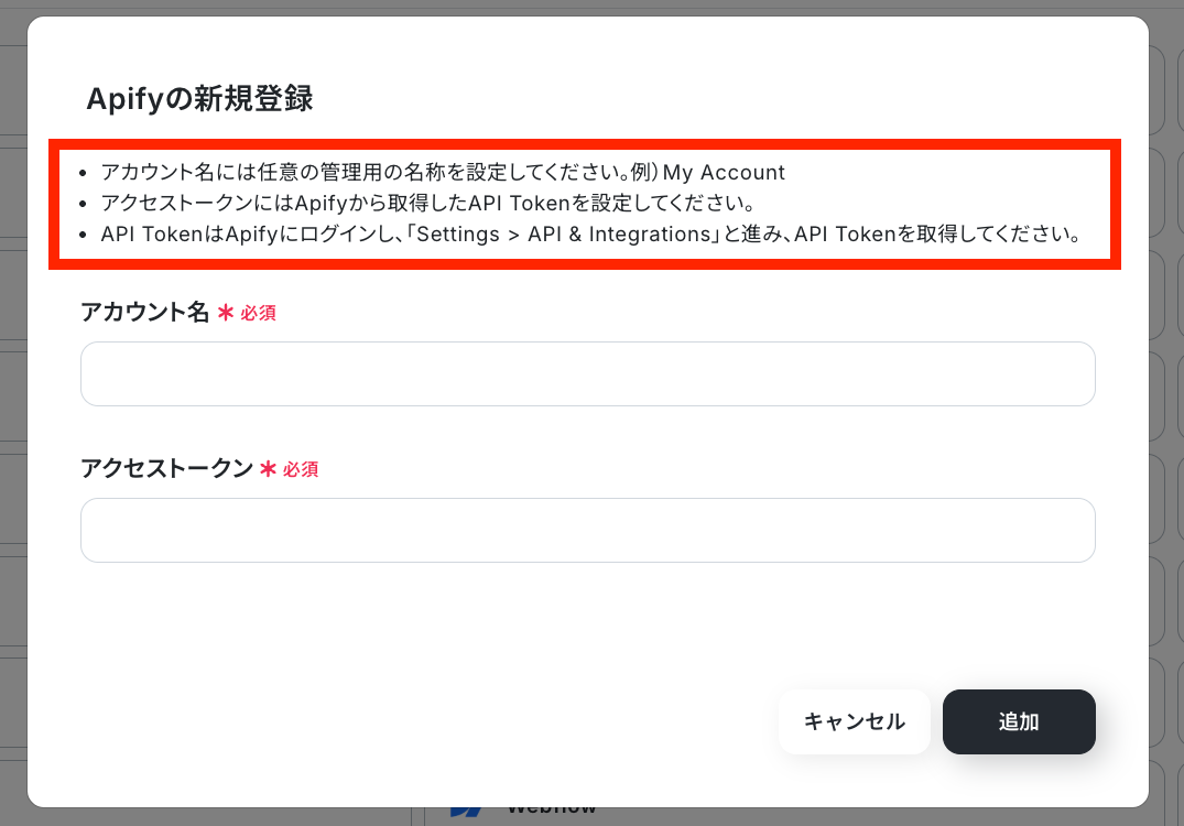 下の画像の赤枠部分を確認しながら「アカウント名」と「アクセストークン」を入力してください。 最後に「追加」ボタンをクリックしたら連携完了です!