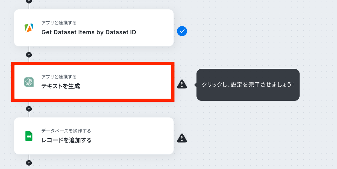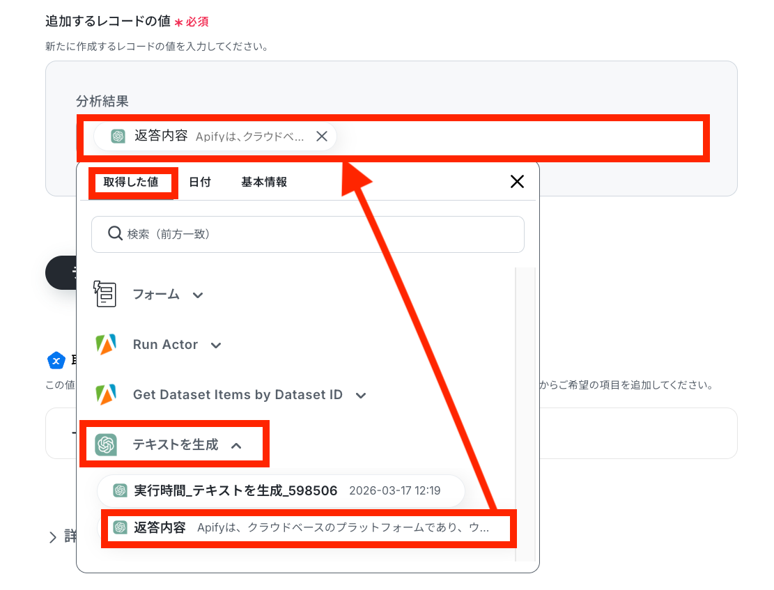 「追加するレコードの値」にChatGPTで生成したテキストを埋め込みます。
