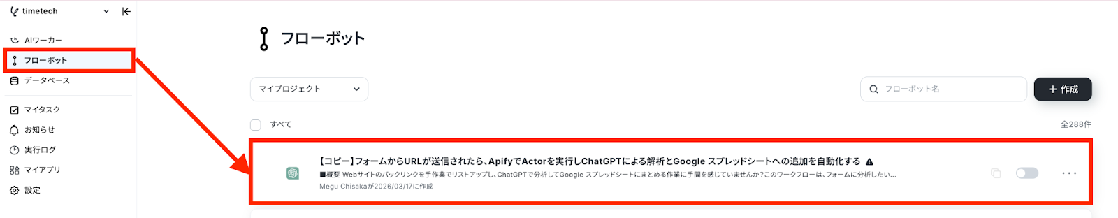 テンプレートがフローボット内の「マイプロジェクト」にコピーされると、このような画面が表示されます。