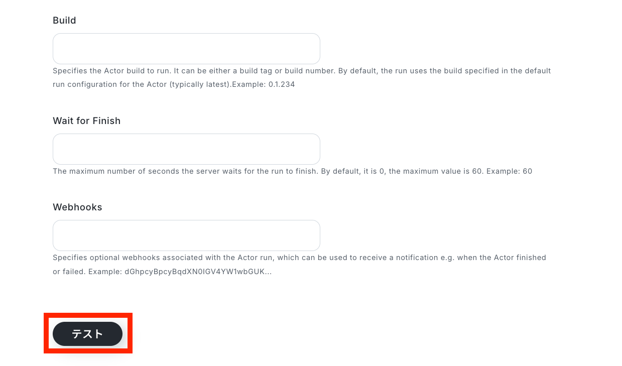 ステップ4:ApifyのRun Acutor設定 「Run Actor」をクリックします。