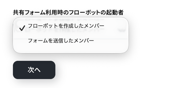 最後に「共有フォーム利用時のフローボットの起動者」を選択しましょう。 選択できたら「次へ」を押します。 ※フローボットの起動者に関する詳しい内容はフォームの基本設定・オプション設定について をご確認ください。