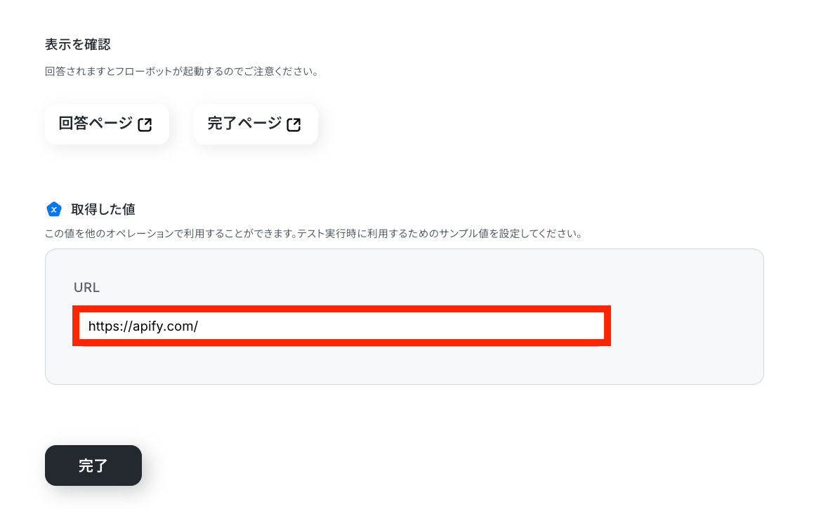 次に入力フォームの「回答のサンプル」を設定します。 全ての設定が完了したら「完了」をクリックしてください。 (今回はApifyの公式サイトのURLを活用しました!)