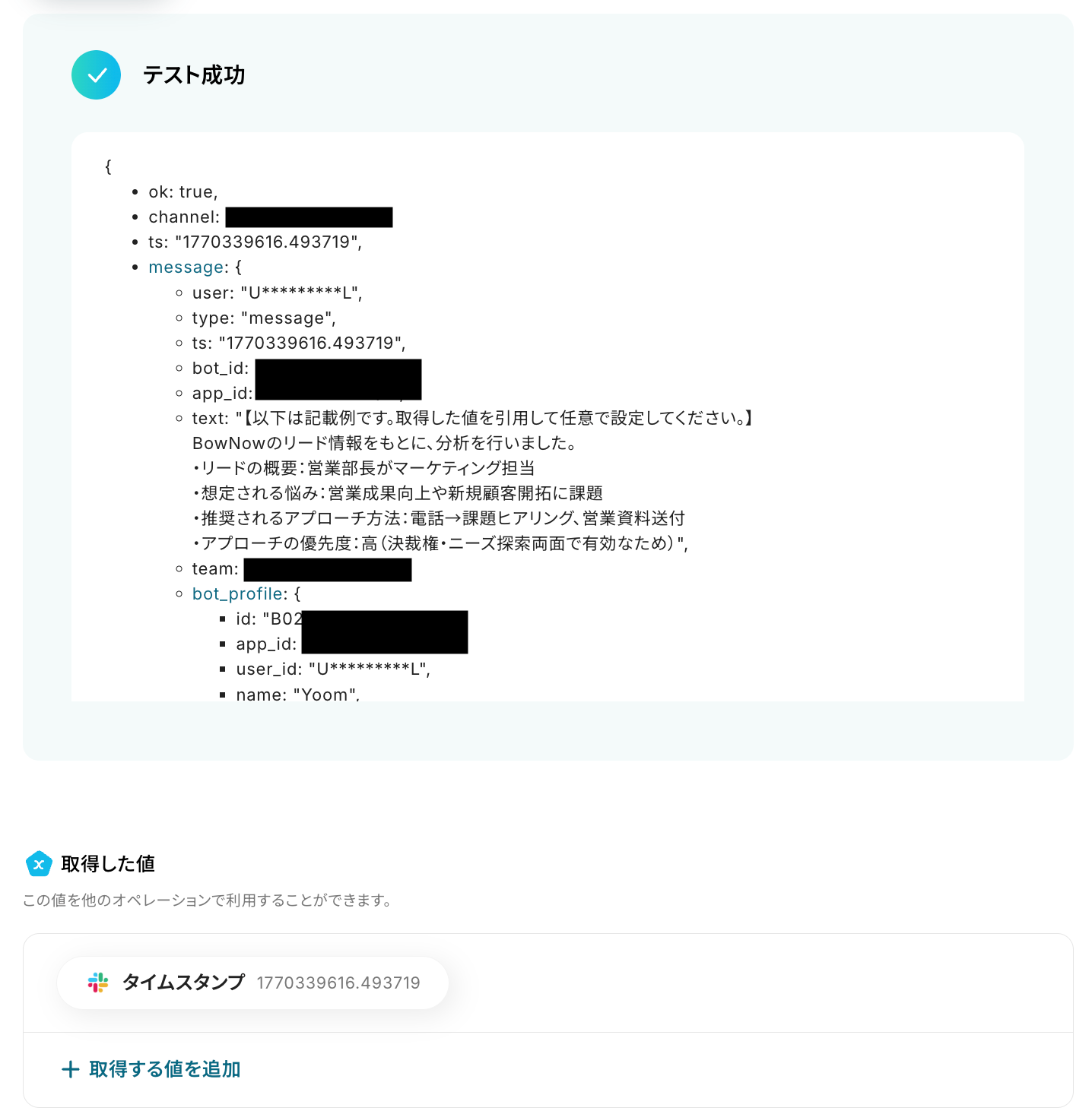 以下の画像の取得した値を利用して、この後のステップでSlackからメッセージの送信が可能です。
