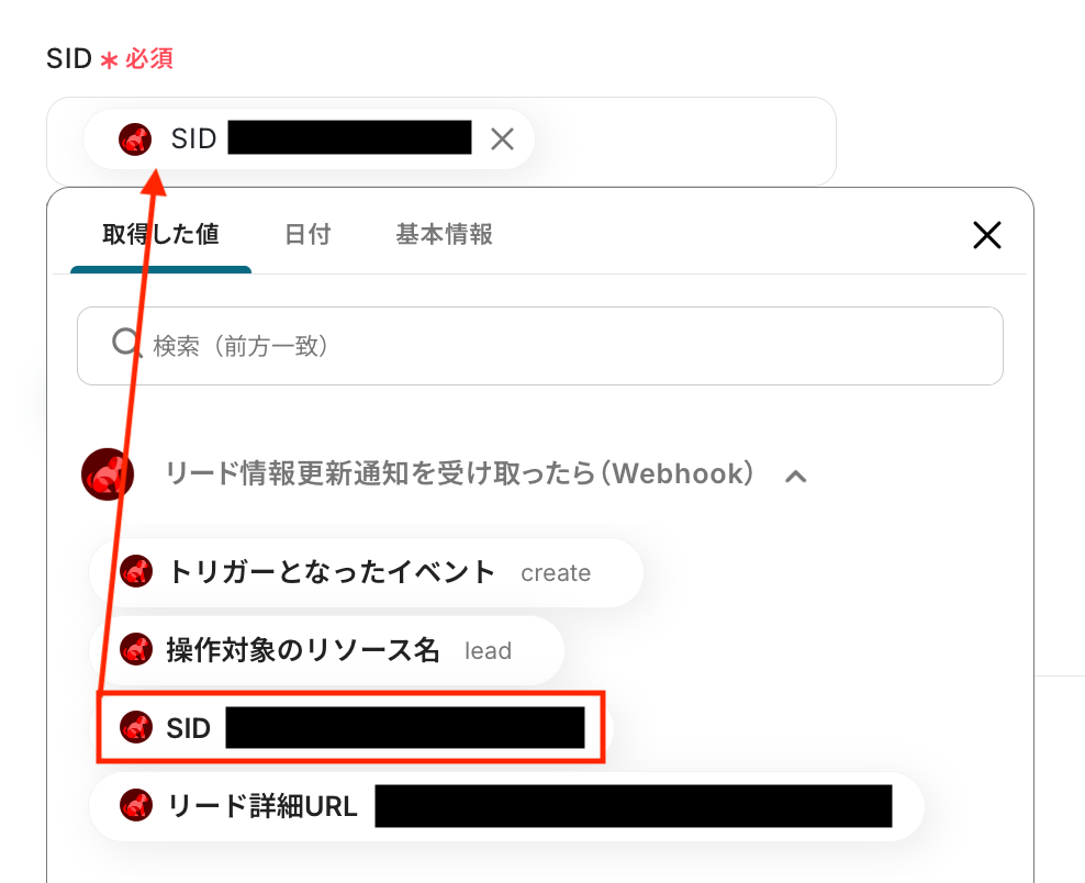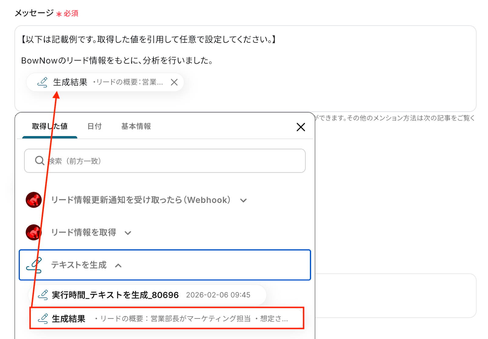 入力欄をクリックすると、前のステップでBowNowから取得した値が表示されるので、選択して入力しましょう。