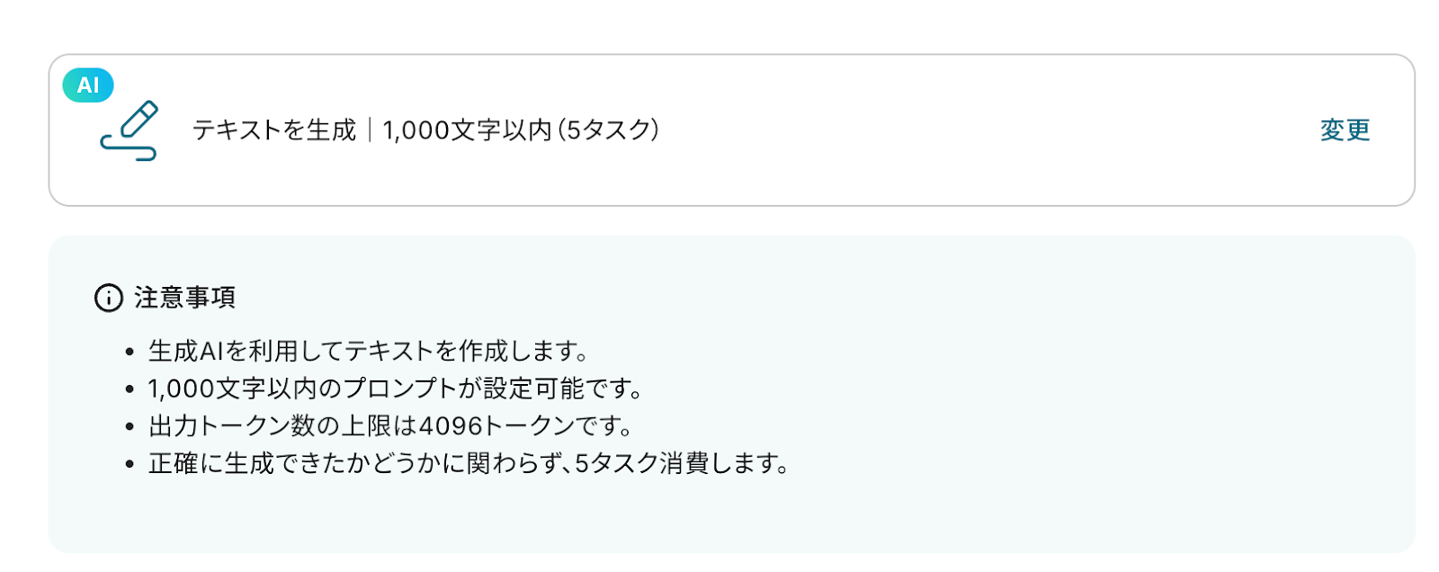 テキストを生成するアクションは、指示可能なプロンプトの文字数によって消費するタスクが異なります。