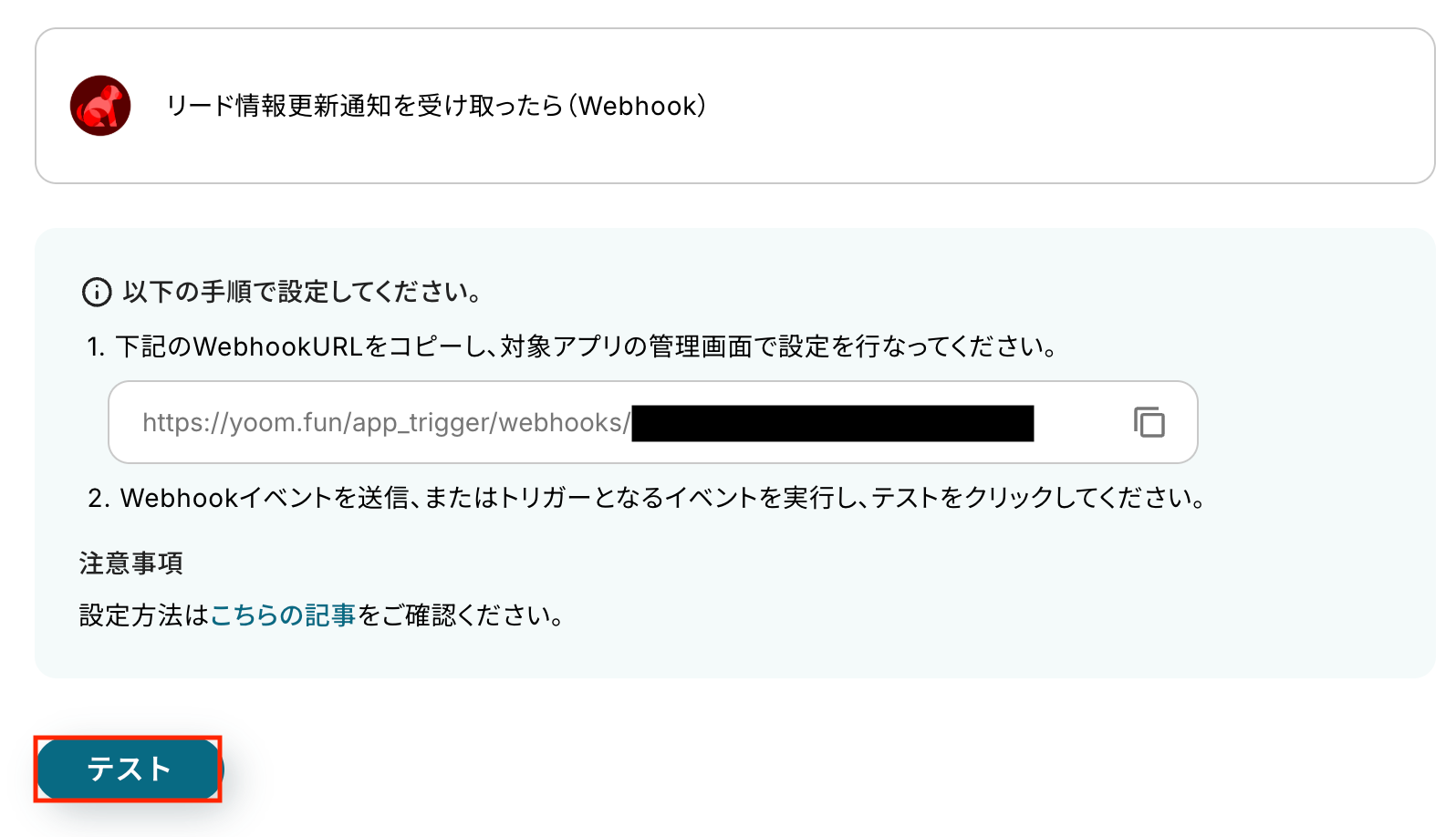 事前準備で行ったリード登録が正しく受信されるかを確認するため、「テスト」をクリックします。