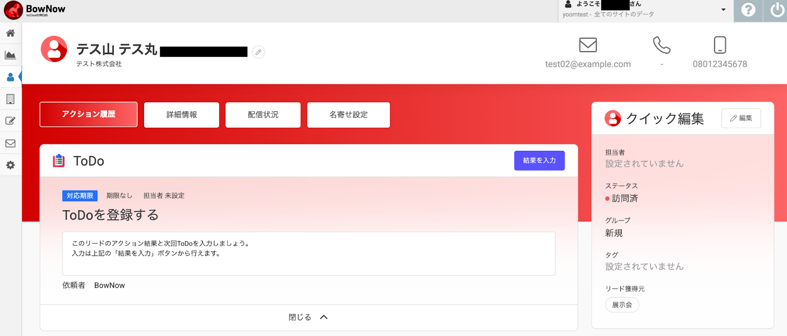 テストに成功すると、BowNowに登録されたリードの詳細情報が表示されます。