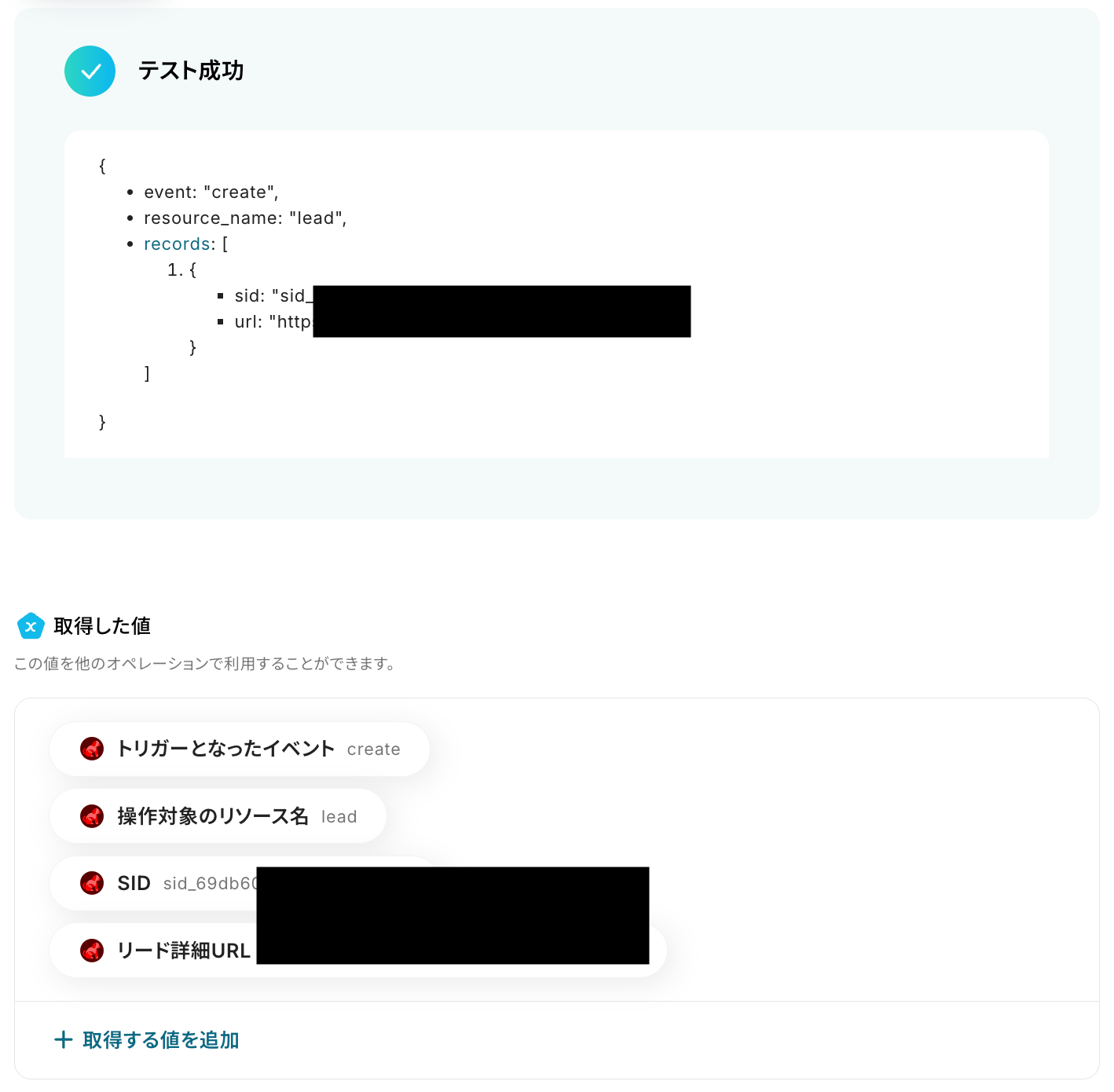 以下の取得した値は、この後のステップで利用できます。