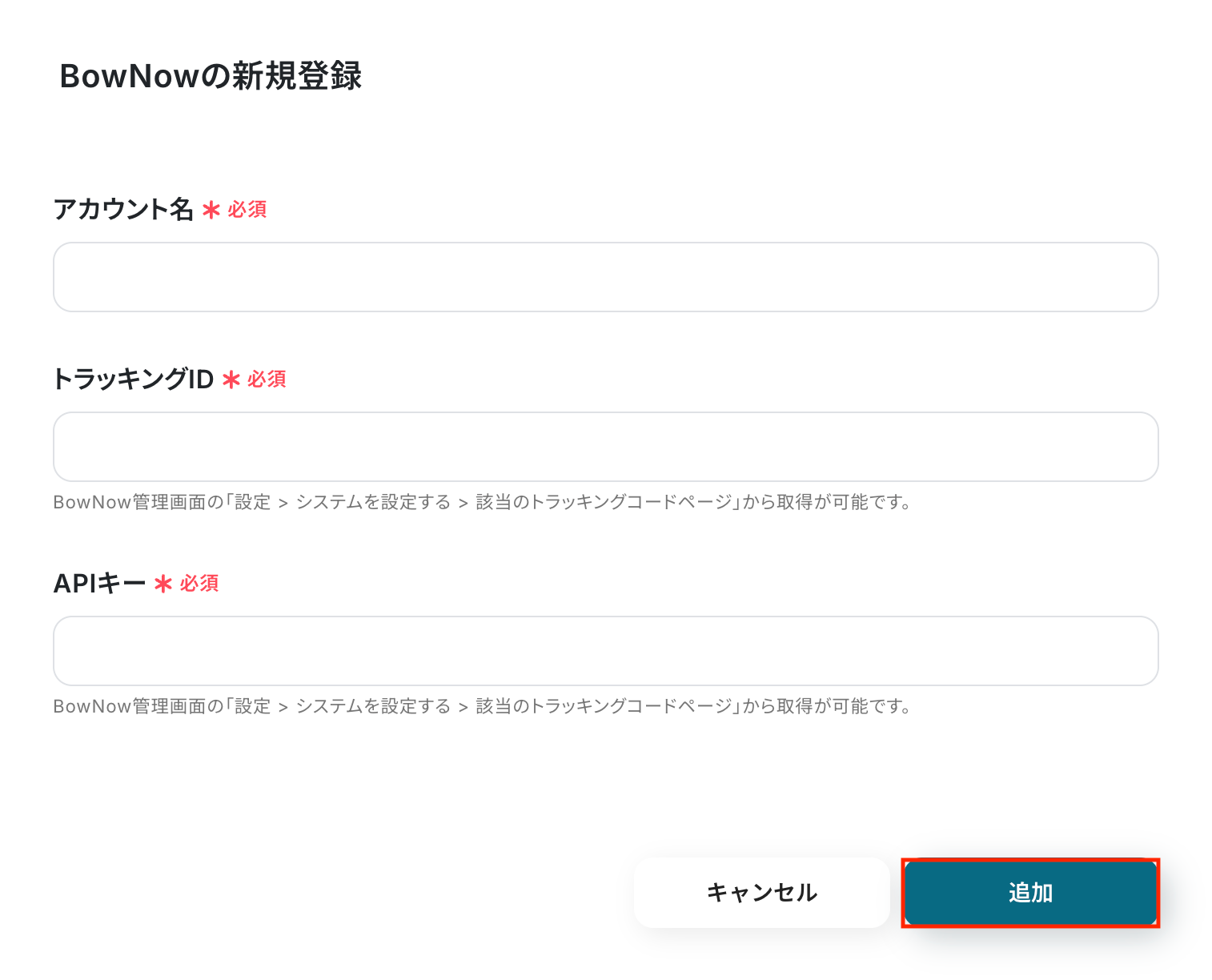 以下の画面が表示されるので、アカウント名、トラッキングID、APIキーをそれぞれ注釈に沿って入力し、「追加」をクリックしましょう。