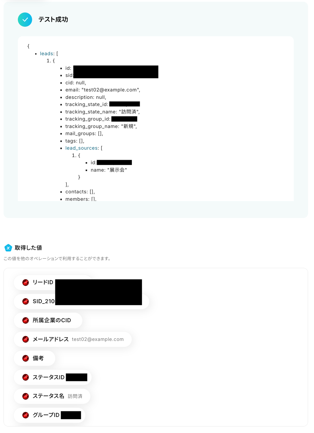 テストに成功すると、BowNowに登録されたリードに関する情報が表示されます。
