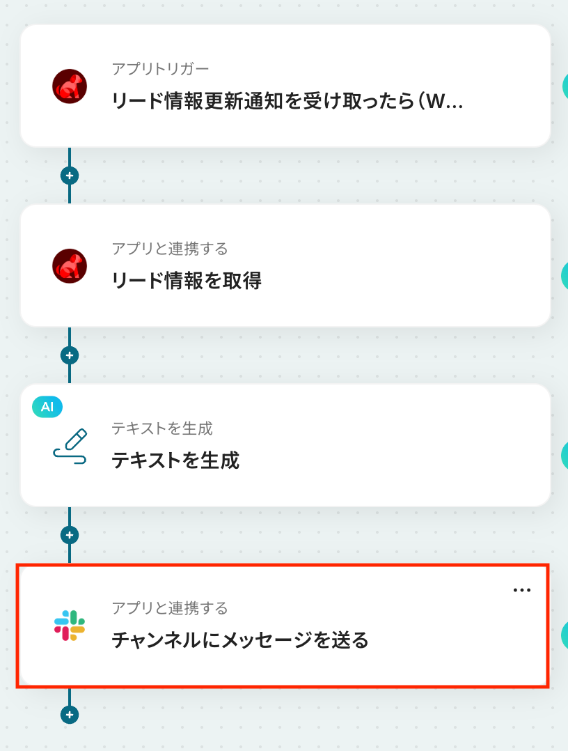 - 最後に、オペレーションでSlackの「メッセージを送信する」アクションを設定し、AIが生成したテキストを指定のチャンネルに通知します