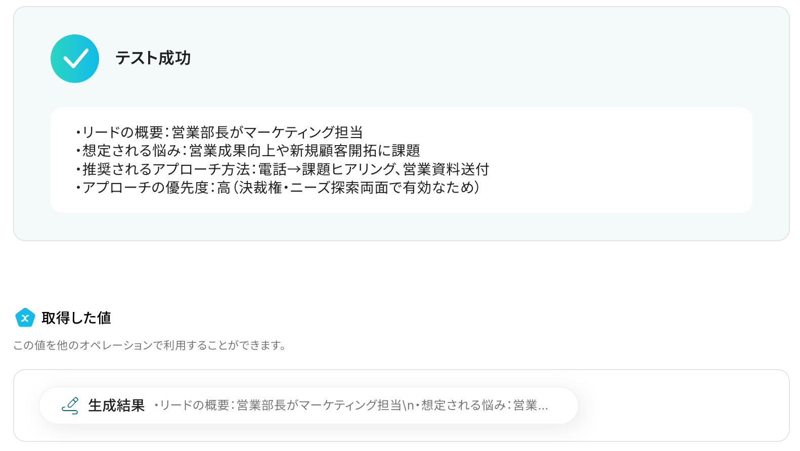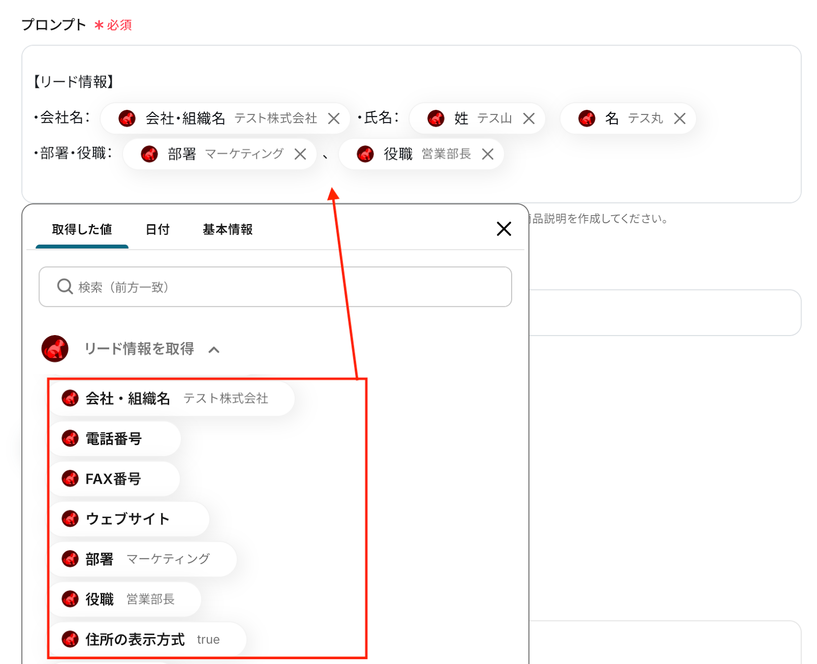 入力が完了したら「テスト」をクリックして、設定した内容でリードの詳細情報が正しく取得されるか確認しましょう。