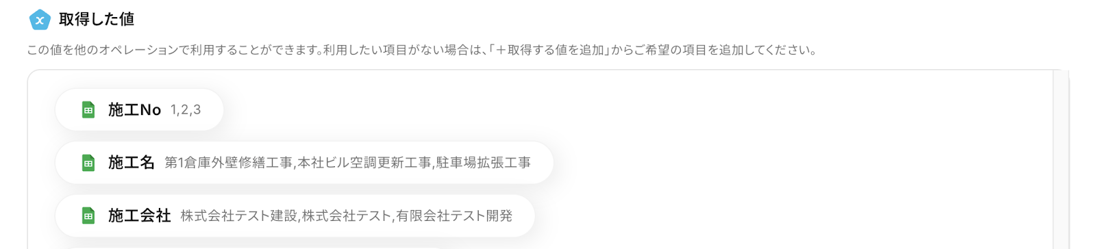 テストに成功すると「取得した値」としてGoogle スプレッドに入力されているデータがアウトプットされます。