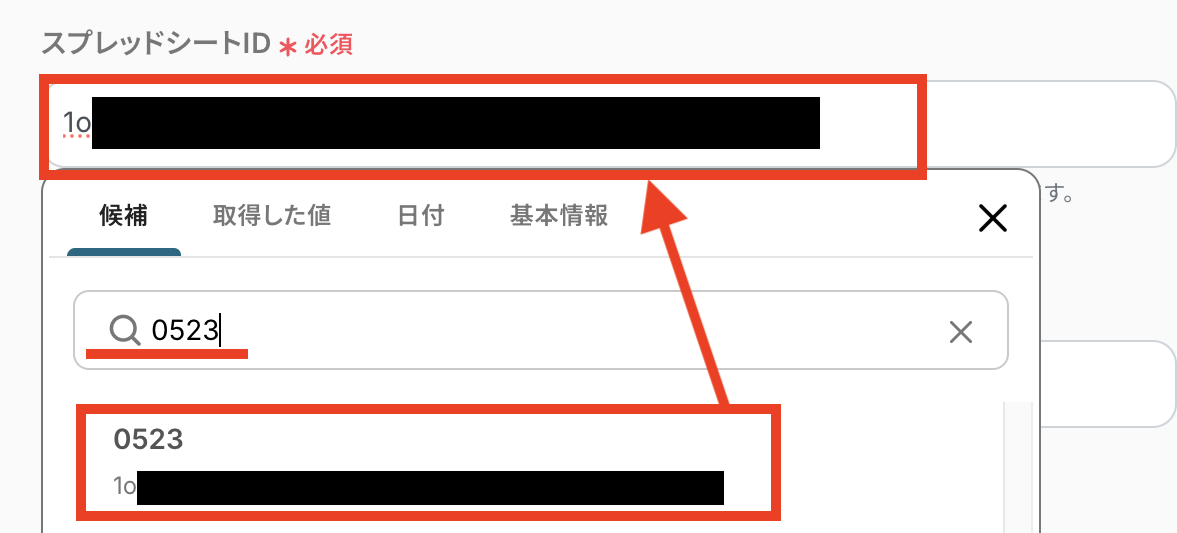 「スプレッドシート」と「タブ名」は候補一覧から選ぶことが可能です。