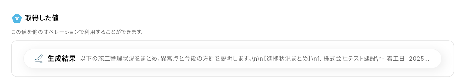 以上が、毎日Google スプレッドシートから施工の進捗情報を取得し、AIで管理してSlackに通知するための連携手順になります。